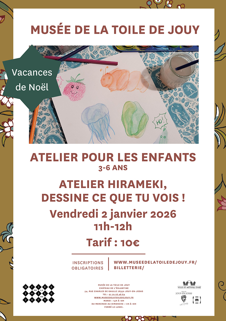 Réservation obligatoire : Vacances scolaires - Musée de la toile de Jouy - Par mail : museetdj@jouy-en-josas.fr ou par téléphone : 01 39 56 48 64